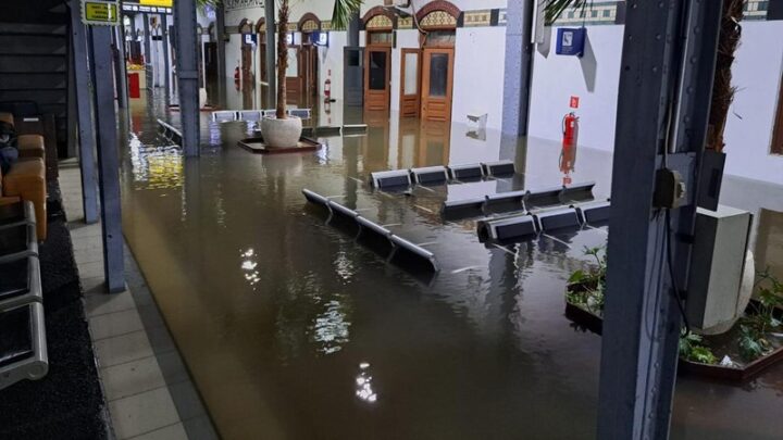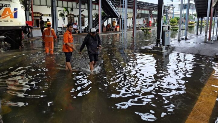 Stasiun Semarang Tawang, Kota Semarang, Jawa Tengah dikepung banjir yang membuat perjalanan kereta api setop total. Begini penampakannya.